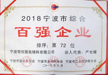 榜單是根據(jù)2017年銷售(營業(yè))收入大小為序進行排名的。萌恒服裝輔料以369391萬元的營業(yè)收入位居2018寧波市綜合百強企業(yè)第72位,較去年排名提升14位;位居制造業(yè)百強企業(yè)第38位,較去年排名提升8位。萌恒工貿(mào)位居寧波·競爭力百強企業(yè)排名第73位。