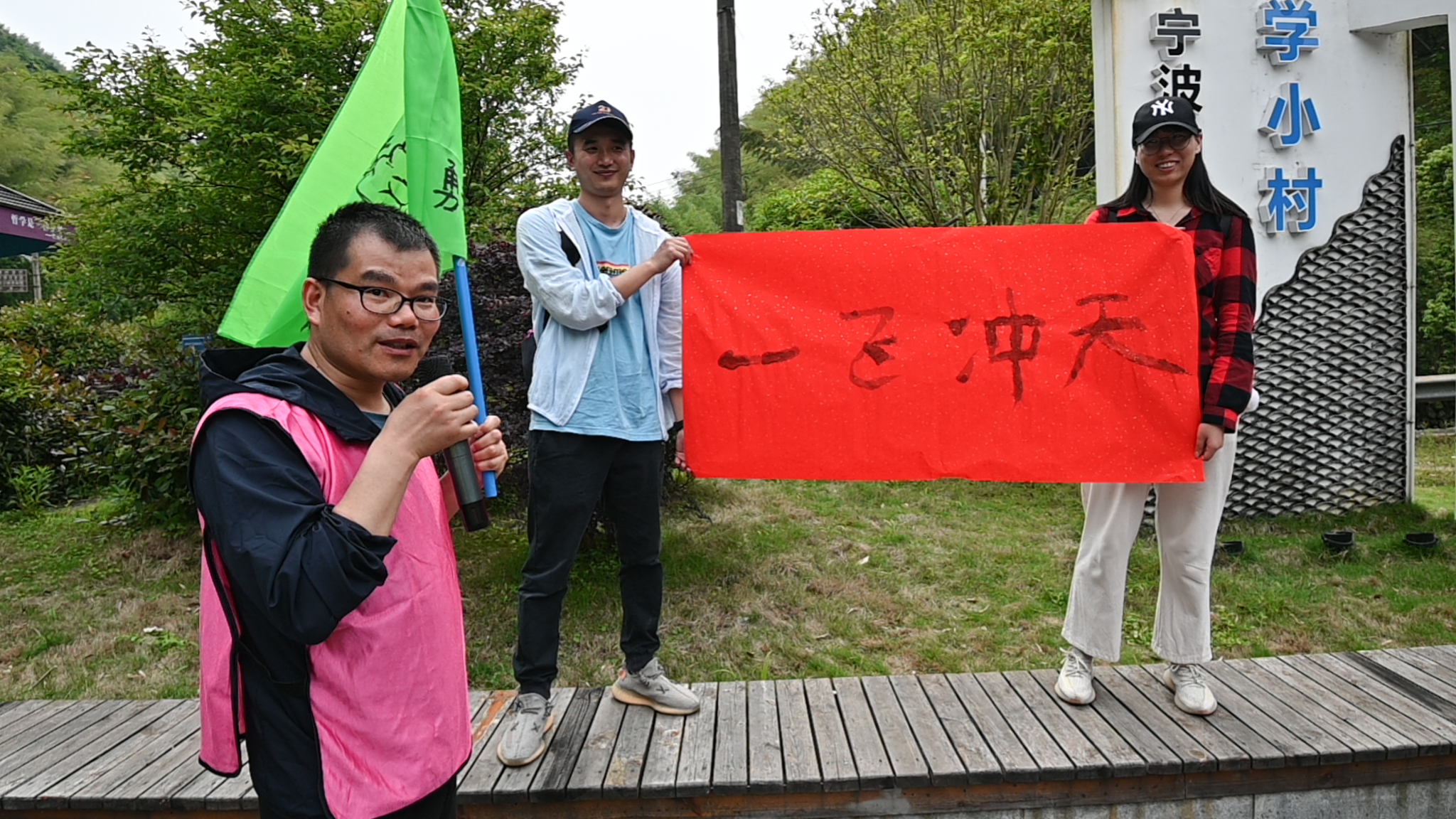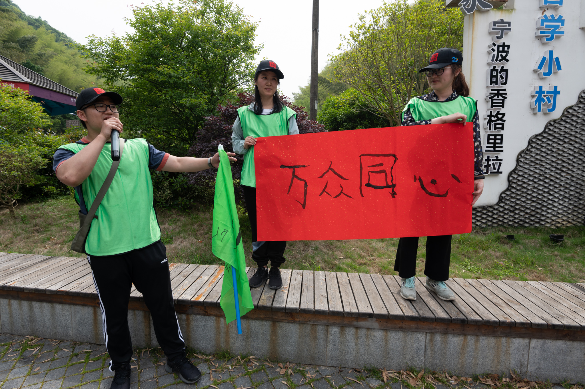 妙筆生花中每隊(duì)的隊(duì)員需要在不觸碰到毛筆的情況下,用繩子拉著中間特大號(hào)的毛筆在紅紙上寫下最能代表自己隊(duì)伍今天徒步感想的四字詞語(yǔ)。“上下一心”“齊心協(xié)力”“萬(wàn)眾同心”簡(jiǎn)短的四個(gè)字代表了大家的凝聚力。
