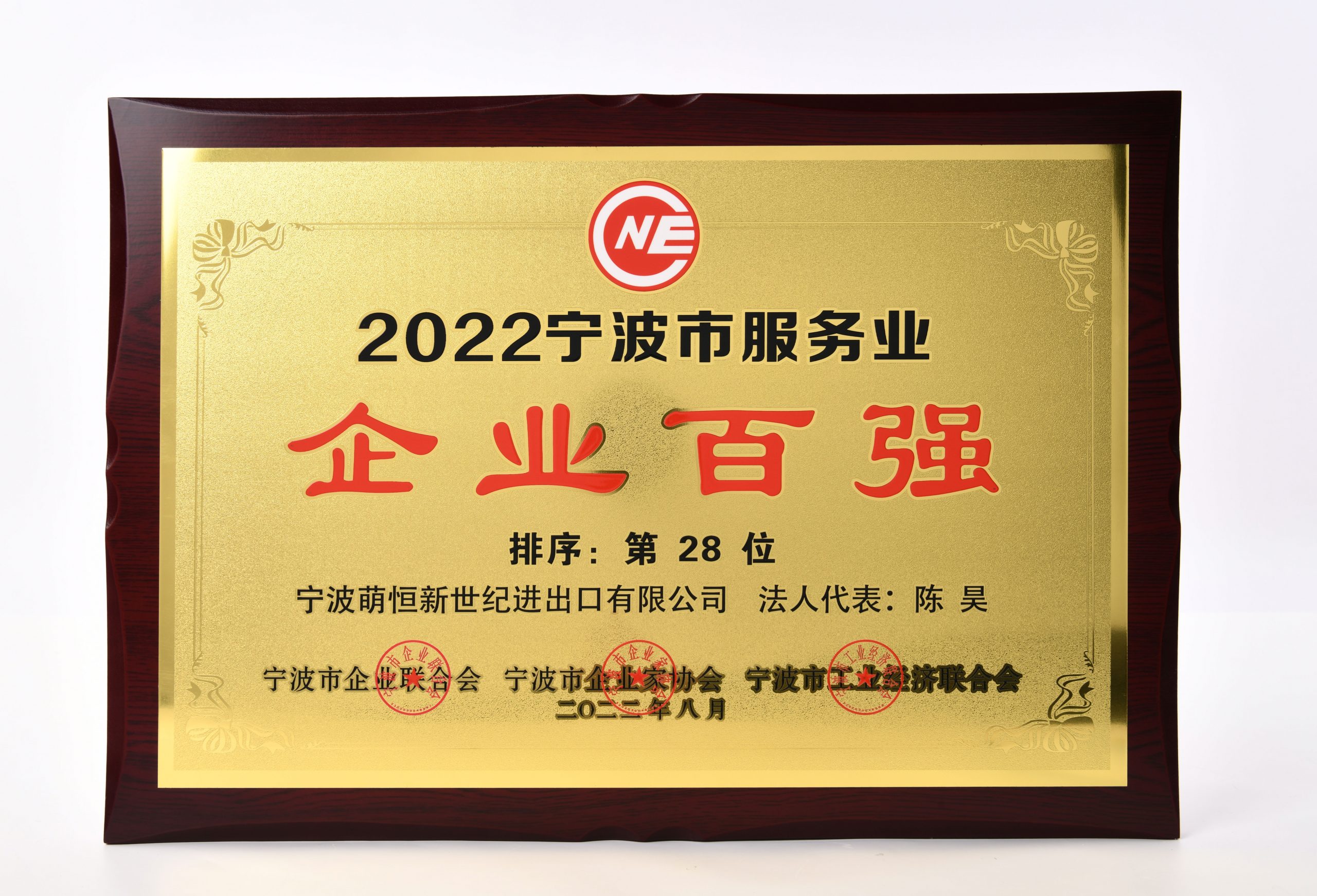 萌恒新世紀(jì)進(jìn)出口有限公司憑借優(yōu)異的綜合力、出色的競爭力、穩(wěn)健的發(fā)展力榮膺“2022寧波市服務(wù)企業(yè)百強(qiáng)28位”、“2022寧波市綜合企業(yè)百強(qiáng)94位”。
