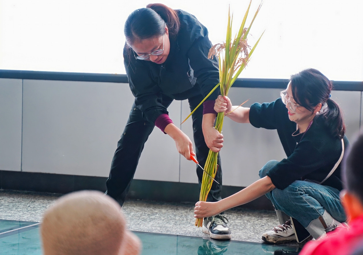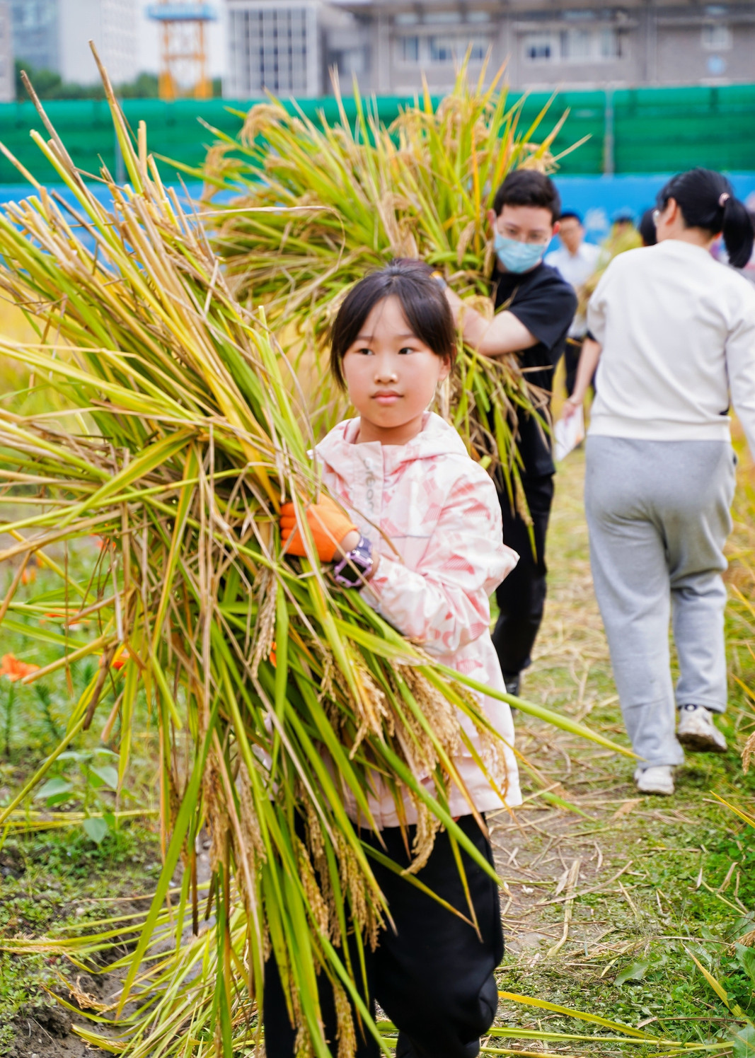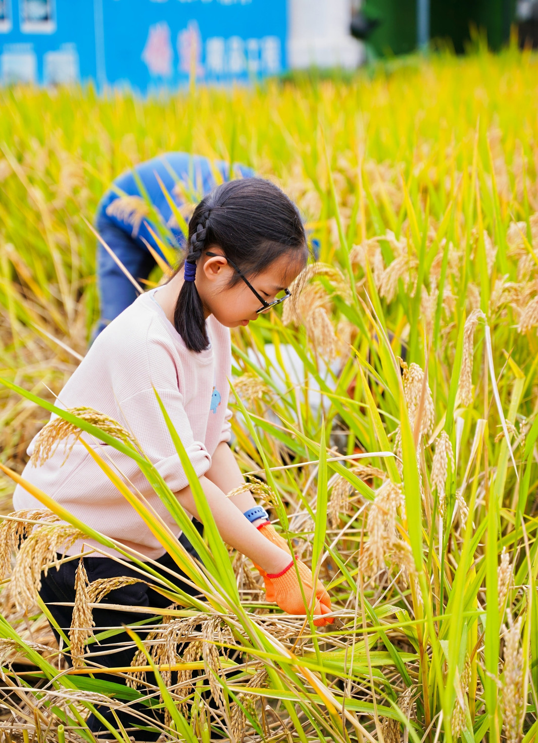 最后登場的是激動人心的水稻收割環(huán)節(jié),家長與孩子們攜手踏入金黃的水稻田,瞬間化身為勤勞的農夫。稻田里,有的家庭分工明確,家長負責收割,孩子們則負責搬運,配合默契十足;有的家庭則全家齊上陣,共同體驗收割的樂趣。孩子們初次體驗水稻收割,臉上洋溢著好奇與興奮的笑容,盡管動作略顯生疏,但那份認真的態(tài)度讓人動容。收割完成后,大家又一同進行脫穗、裝袋、稱重,每一個步驟都充滿了歡聲笑語,整個稻田都沉浸在一片歡樂的海洋之中。