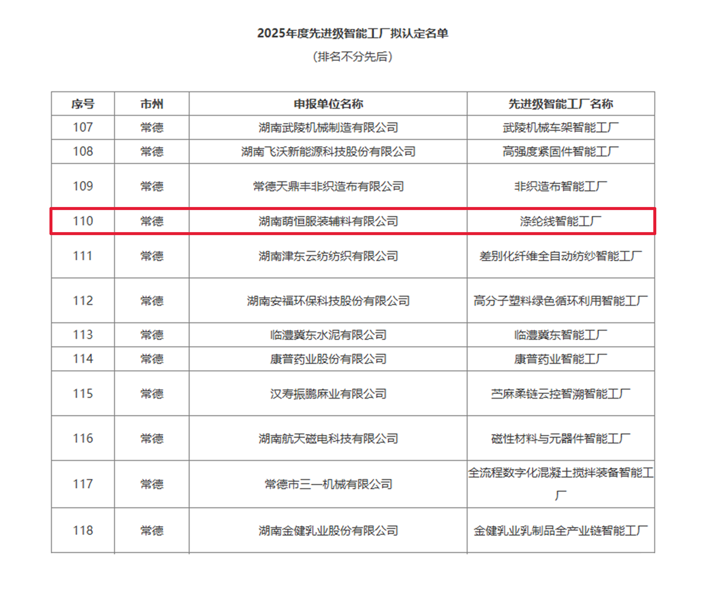 近日,湖南省工業和信息化廳、湖南省國防科技工業局公布了《關于2025年度先進級智能工廠擬認定名單的公示》,湖南萌恒服裝輔料有限公司滌綸線智能工廠憑借卓越實力成功入選! 先進級智能工廠是由湖南省工信廳、省發展改革委、省財政廳、省國資委、省市場監管總局、省數據局六部委于今年首次聯合開展培育和認定,旨在構建智能工廠、解決方案、標準體系三位一體工作體系,打造智能制造升級版
