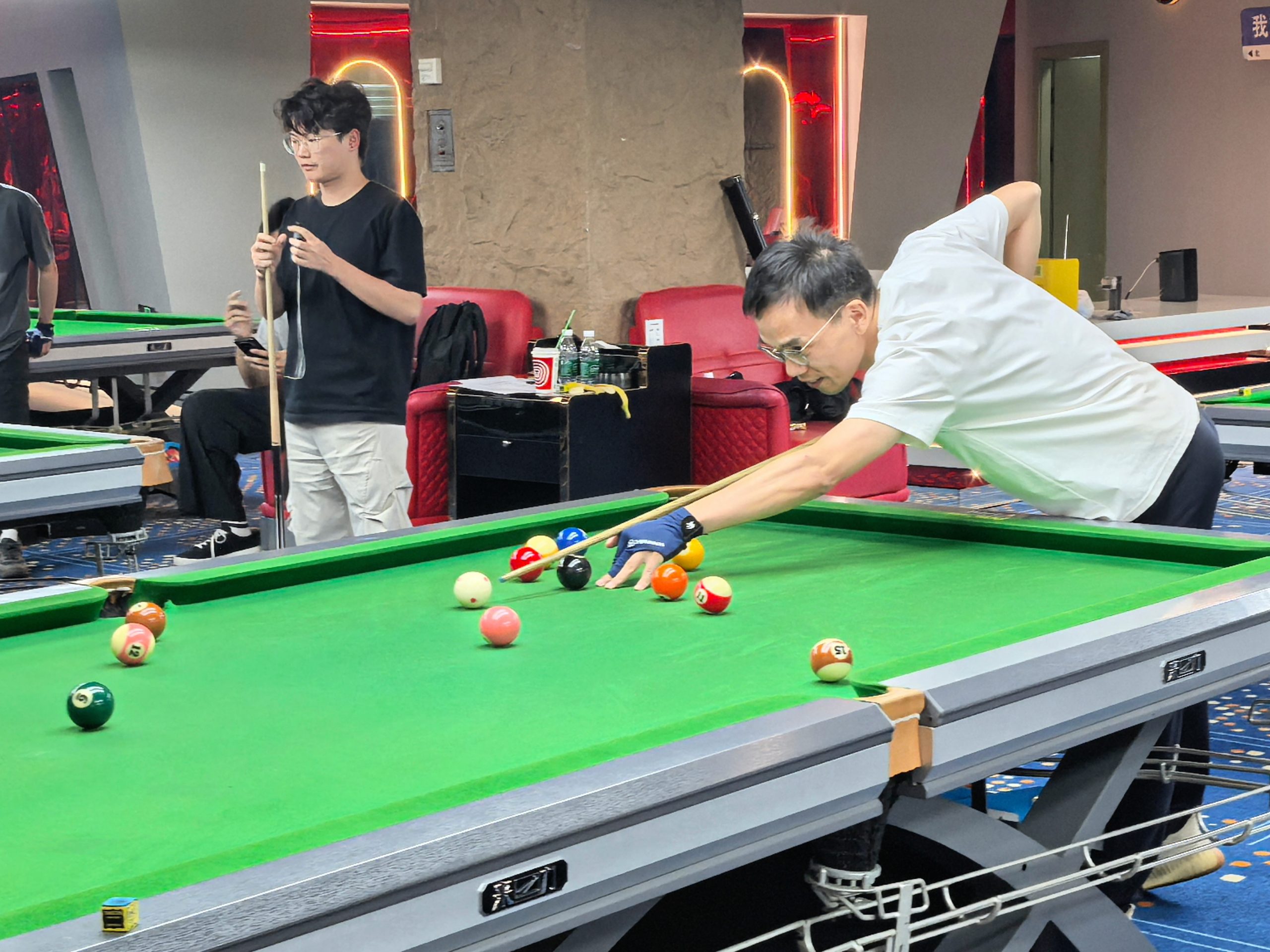 賽前的趣味互動(dòng)環(huán)節(jié)短暫預(yù)熱,“爭分奪秒”的協(xié)作比拼與“趣味推桿”的精準(zhǔn)考驗(yàn),快速調(diào)動(dòng)起現(xiàn)場(chǎng)氛圍,中式八球個(gè)人賽順勢(shì)拉開序幕。第一階段小組循環(huán)賽,19名選手被分為四組,組內(nèi)采用“一局定勝負(fù)”的單循環(huán)制,因此每一場(chǎng)對(duì)決都至關(guān)重要。賽場(chǎng)上,選手們狀態(tài)專注,俯身、架桿、瞄準(zhǔn)、出桿一氣呵成。有的選手擅長精準(zhǔn)走位,白球在球桌上靈活穿梭,為下一擊創(chuàng)造絕佳角度;有的選手則以防守見長,巧妙避開對(duì)手進(jìn)攻路線,將局勢(shì)牢牢掌控在自己手中。經(jīng)過多輪激烈比拼,每組前2名成功晉級(jí)八強(qiáng)。